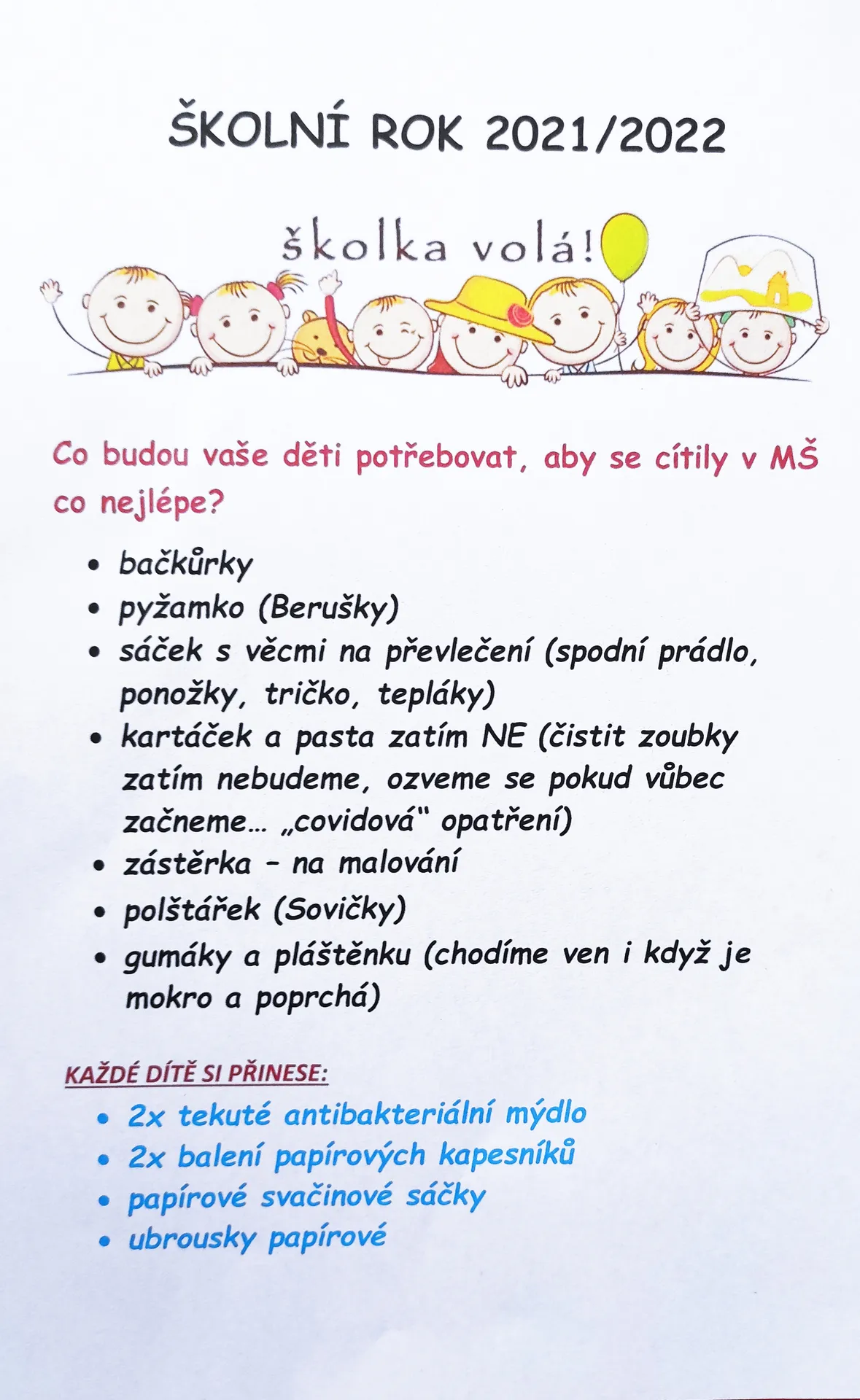Co budou děti do mš potřebovat 2021-2022